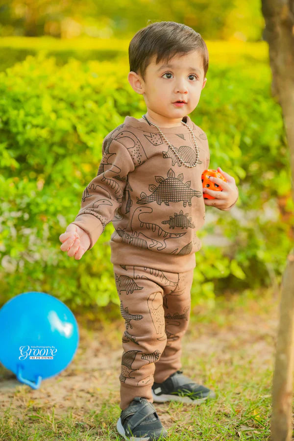 Fleece Fabric Brown Dinosaur Printed Kids Winter Suit ( Each )